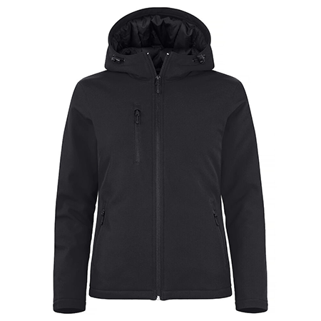 Een modern gesneden, gewatteerd softshell jack met capuchon.